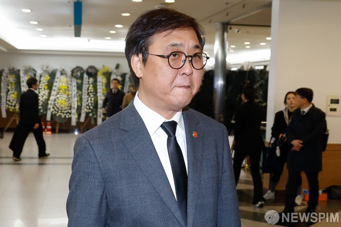 [서울=뉴스핌] 양진영 기자 = 최휘영 문화체육관광부 장관이 25일 별세한 배우 이순재의 빈소를 조문하고 애도의 뜻을 전했다. 고인에게 추서된 금관문화훈장도 유족에게 직접 전달했다.