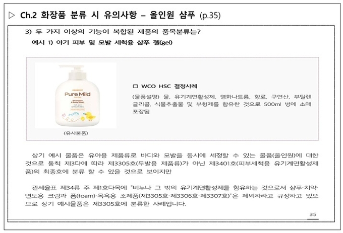 특히 소비자에게는 익숙하지만 품목분류 기준이 까다로운 제품의 분류 사례를 다수 수록하여, 수출입 실무자의 이해를 높였다. 예를 들어, 시트 형태의 마스크팩은 제3304호(기초화장품)가 아닌 제3307호(기타화장품)에 분류된다. 피부와 모발을 동시에 세정할 수 있는 제품(올인원)은 제3401호(피부세척용 제품)가 아닌 제3305호(두발용 제품류)로 분류되고 있다.
