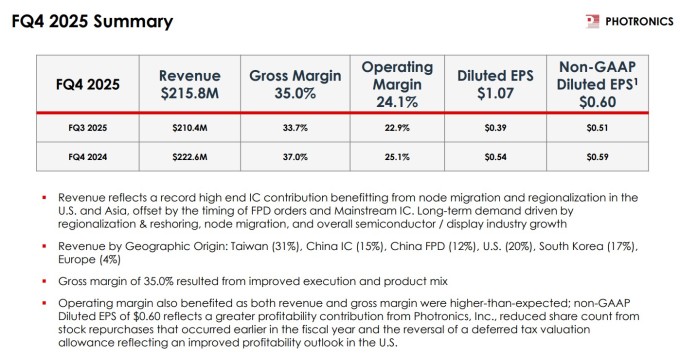 포트로닉스의 4분기 실적은 첨단 집적회로(IC) 포토마스크 수요 증가와 미국 및 아시아 시장에서의 견조한 호조에 힘입어 월가 예상치를 큰 폭으로 상회했다. 회사는 4분기 매출 2억1580만 달러를 기록하며 애널리스트 컨센서스 2억519만 달러를 뛰어넘었다. 전분기 대비로는 3% 증가했으나 전년 동기 대비로는 3.1% 감소했다.