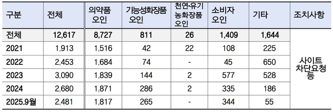 서 의원이 식약처로부터 제출받은 자료에 따르면 2021년부터 올해 9월까지 화장품 부당광고 적발건수는 총 1만 2,617건에 이른다.