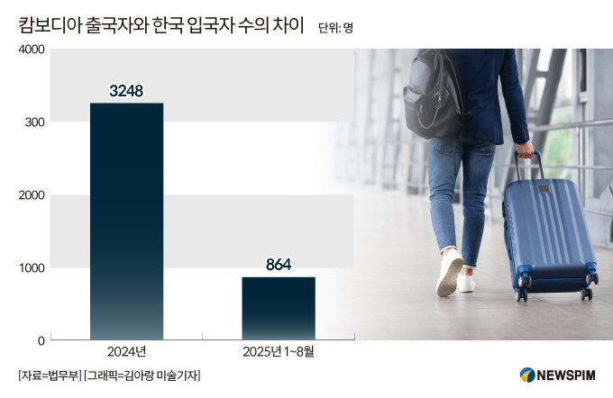 법무부가 추산하는 수치는 이보다 더 많다. 2021년 113명에 불과했던 캄보디아 출국자와 한국 입국자 수의 차이는 2022년 3209명, 2023년 2662명, 2024년 3248명 등이다. 올해도 8월까지 864명이 돌아오지 않은 것으로 추정된다. 더불어민주당 박찬대 의원실이 법무부로부터 받은 자료를 분석한 결과다.