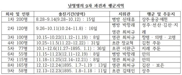 갑오년 당시 지방군 중 청주의 진남영과 전주의 무남영, 그리고 춘천의 진어영이 진압군을 보냈지만 출진 장졸의 수와 행군 일정 등을 전해주는 기록은 『교남수록』이 유일하다. 이 기록에 나타난 남영병의 9차례 출진 인원과 기간, 그리고 행군지와 주둔지는 다음과 같다.