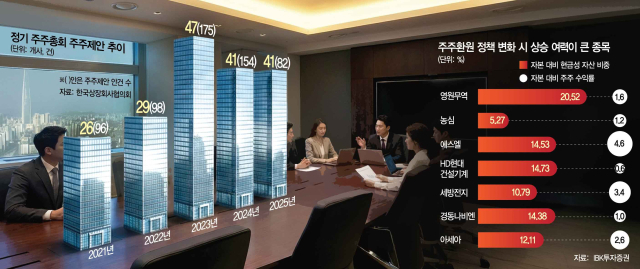 증권가에서는 주주 환원이 필요한 저평가 종목을 찾는 움직임도 활발해지고 있다. IBK투자증권은 기업가치 제고 계획을 발표하거나 행동주의 활동이 발생했을 때 주가 상승 가능성이 큰 기업으로 영원무역(111770)·농심(004370)·에스엘(005850)·HD현대건설기계(267270)·세방전지(004490)·경동나비엔(009450)·아세아(002030)·동아쏘시오홀딩스(000640) 등을 꼽았다. 자기자본 대비 현금성 자산이 5~20%로 충분하지만 주주 환원 성향은 20% 미만인 기업들이다. LS증권도 행동주의 펀드들이 배당 확대 등 주주 제안 대상으로 삼을 가능성이 큰 기업으로 삼성전자(005930)·삼성물산(028260)·LG(003550)·농심·대덕전자(353200) 등을 꼽았다. 권순호 IBK투자증권 연구원은 “이익과 현금 창출력이 양호한데 그동안 주주 환원 성향이 낮았던 기업들은 구조적으로 디스카운트를 받고 있다”며 “주주 환원 정책이 달라지면 재평가를 통해 크게 상승할 여지가 있다”고 했다.