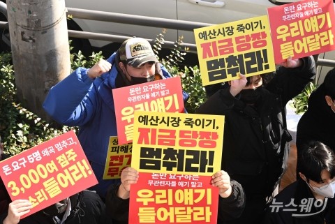 더본코리아 가맹점주모임이 19일 오후 서울 서초구 전국가맹점주협의회 앞에서 열린 전가협의 사실 왜곡 및 여론몰이 중단 촉구 기자회견에서 구호를 외치고 있다.