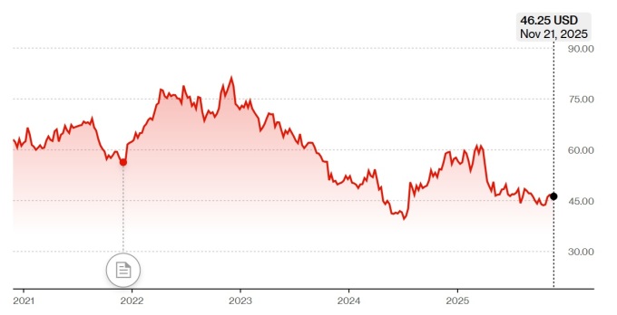 브리스톨 마이어스 스큅은 11월24일(현지시각) 47.76달러에 거래를 마감해 연초 이후 약 16% 하락했다. 지난 3년간 업체의 주가는 40% 가량 떨어졌고, 2022년 12월 기록한 고점 81.13달러에서 거의 반토막이 난 상태다.
