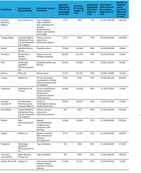 27일 관련 업계에 따르면 미국 보험청(CMS)은 2027년부터 적용될 고가 처방약 15종의 협상 가격을 공개했다. 이는 2022년 인플레이션 감축법(IRA)에 따른 두 번째 약가 협상 결과다.