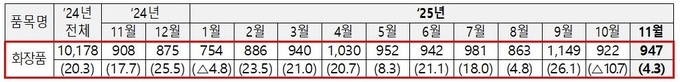 산업통상부가 발표한 ‘2025년 11월 수출입 동향’에 따르면 화장품 수출은 전년 동기 대비 4.3% 증가한 9억 4,700만 달러를 기록했다.