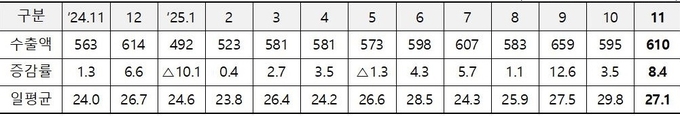 11월 우리나라 수출은 역대 11월 중 최대 실적인 610억 4,000만 달러(+8.4%)를 기록하면서 6개월 연속 증가했으며, 1~11월 누적 수출은 6,402억 달러로 동 기간 역대 최대치를 3년 만에 경신했다. 조업일수를 고려한 일평균 수출은 13.3% 증가한 27억 1,000만 달러로 역대 11월 중 1위 실적을 달성했다.