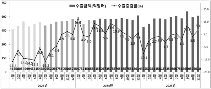 김정관 산업통상부 장관은 “11월 수출은 6개월 연속 우상향 흐름을 이어가고 있다”며 “이는 미 관세를 포함한 글로벌 보호무역주의 확산으로 수출 여건이 녹록치 않은 상황에서도 우리 기업들이 위기를 기회로 전환시키는 능력을 발휘한 결과”라고 평가했다.