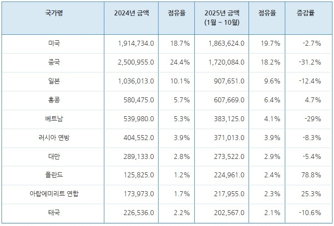 이밖에 ▲베트남(3억 8,313만 달러, 4.1%) ▲러시아 연방(3억 7,101만 달러, 3.9%) ▲대만(2억 7,352만 달러, 2.9%) ▲폴란드(2억 2,496만 달러, 2.4%) ▲아랍에미리트 연합(2억 1,796만 달러, 2.3%) ▲태국(2억 257만 달러, 2.1%) 등이 상위 10위권에 이름을 올렸다.