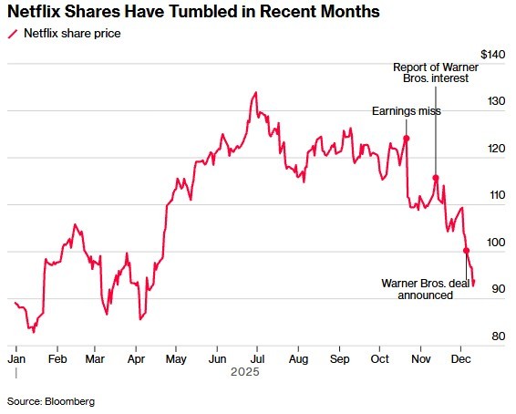 [서울=뉴스핌] 이홍규 기자 = 넷플릭스(NFLX)가 워너브라더스디스커버리(WBD) 인수를 추진한다는 소식에 회의론이 확산되며 시가총액 400억달러가 단 6거래일 만에 증발했다. 소매투자자들에게 이는 강력한 매수 신호로 받아들여졌다.