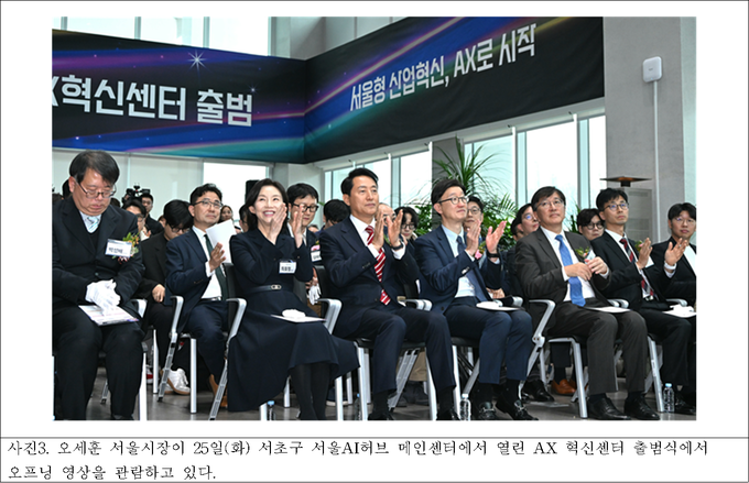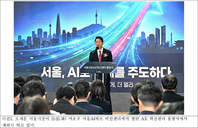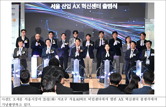 서울시는 이러한 구조적 한계를 해결하기 위해, 11월 25일(화) 서울 AI 허브(태봉로108) 메인센터에서 ‘서울 산업 AX 혁신센터’와 ‘서울 AI 혁신협의회’ 출범식을 개최하고 산업·대학·연구·스타트업이 함께 참여하는 서울형 산업 AI 전환 생태계의 본격 가동을 선언했다.