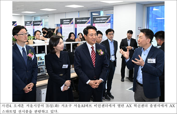 오세훈 서울시장은 “서울은 AI전환 흐름을 따라가는 도시가 아닌 기준을 만들고, AI 시대 표준이 되는 도시로 나아가고 있다”며 “서울 산업 AX센터가 서울의 AI 전환 핵심 플랫폼으로 연구-실증-확산의 선순환적인 서울의 미래를 만들어 나갈 것을 확신한다”고 말했다.
