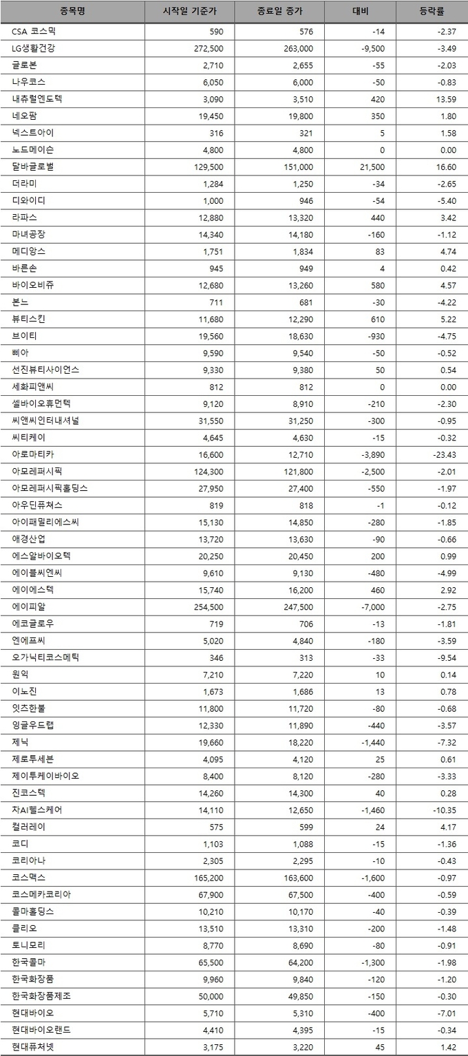 이에 반해 코스닥 상장 새내기 아로마티카(-23.43%)의 주가는 크게 꺾였다. 차AI헬스케어(-10.35%), 오가닉티코스메틱(-9.54%), 제닉(-7.32%), 현대바이오(-7.01%), 디와이디(-5.40%)도 주가가 5% 넘게 빠졌다.
