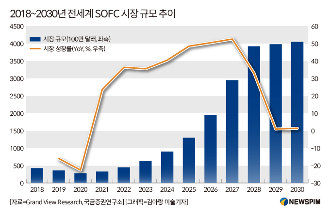 중국 시장조사기관 QY리서치(QY Research)는 같은 기간 전세계 SOFC 시장의 CAGR을 28.9%로 추정했으며, 2030년 SOFC 시장 규모가 761억 위안(약 106억 달러)에 이를 것으로 분석했다.