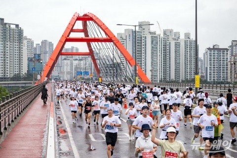 '디즈니런 서울 2025' 행사가 지난 11일 서울 여의도공원 인근에서 개최된 가운데 참가자들이 서강대교 위를 열심히 뛰고 있다.