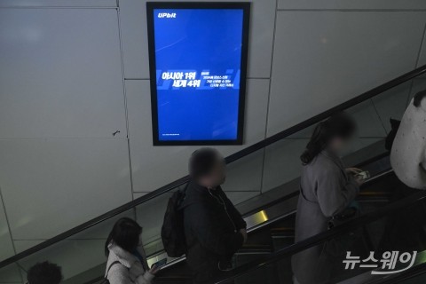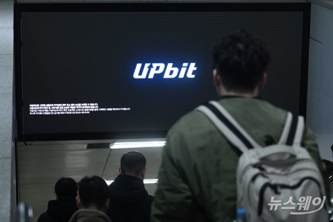 가상자산 거래소 업비트에서 보유하던 암호화폐 24종이 탈취된 27일 오후 서울 강남구 한 지하철역 옥외 전광판에 업비트 광고 영상이 상영되고 있다.