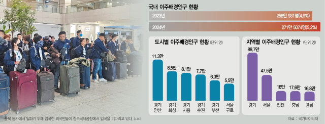 국가데이터처가 8일 발표한 ‘2024년 이주 배경 인구 통계 결과’에 따르면 지난해 11월 1일 기준 국내에 3개월 이상 거주한 이주 배경 인구는 271만 5000명으로 집계됐다. 이는 전년 대비 13만 4000명(5.2%) 증가한 수치로 대한민국 총인구(5180만 6000명)의 5.2%를 차지한다. 총인구 증가율(0.1%)보다도 훨씬 높은 상승 폭이다.