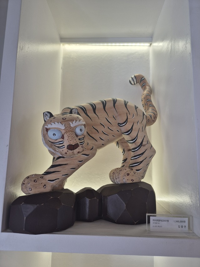 이 작품은 전북특별자치도 무형유산 민속목조각장인 김종연 장인이 민화 속 '까치호랑이'를 현대적으로 재현한 목조조각이다. 위협적이면서도 익살스럽고 정감 어린 표정이 특징이다.
