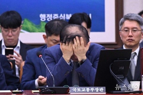 (가운데)김윤덕 국토교통부 장관이 13일 오후 서울 여의도 국회 국토교통위원회에서 열린 국토교통부·행정중심복합도시건설청·새만금개발청에 대한 2025년도 국정감사에 출석해 고개를 푹 숙이며 찡그린 표정을 짓고 있다.