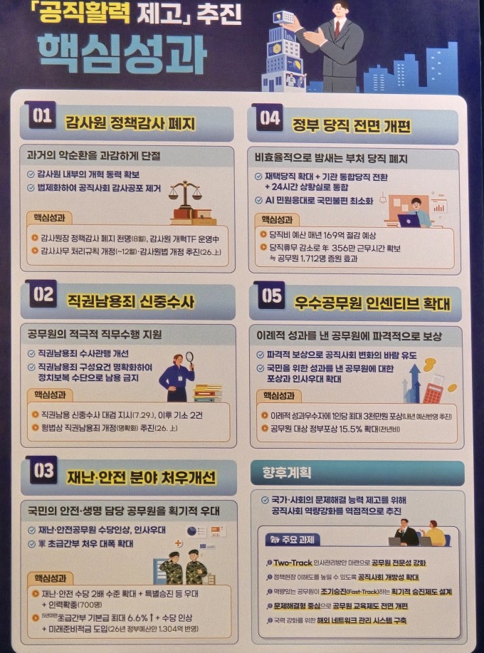 [서울=뉴스핌] 김종원 선임기자 = 이재명 정부가 12일 공직사회 역량 강화를 위해 ▲공직 전문성 강화 ▲공직사회 개방성 확대 ▲획기적 승진 제도 ▲공무원 교육 전면 개편 ▲해외 네트워크 구축 등 5대 추진 과제를 발표했다.