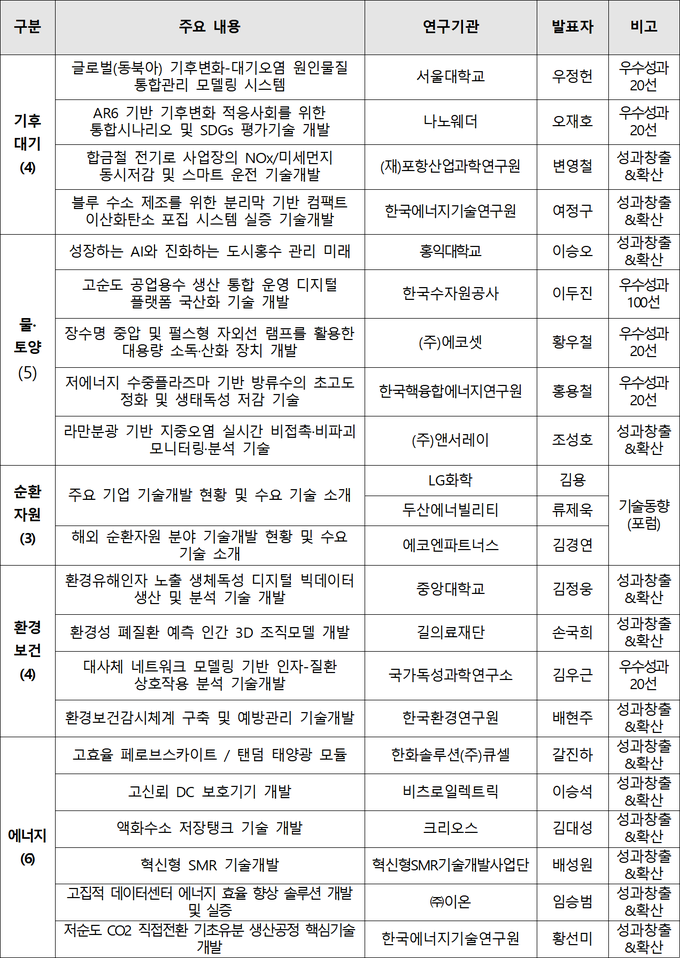 이어지는 2부 성과발표회는 기후·에너지·환경 분야별 대표 성과 및 최신 기술동향을 공유하는 자리로 기후대기(4개), 물토양(5개), 순환자원(3개), 환경보건(4개), 에너지(6개) 등 총 5개 분야 22개 기술이 발표된다.