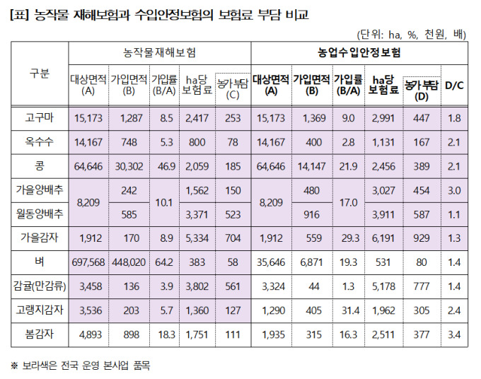 자료에 따르면, 농업수입안정보험의 ha(1㏊는 1만㎡)당 평균 보험료는 농작물 재해보험 대비 전 품목에서 높게 나타났다.