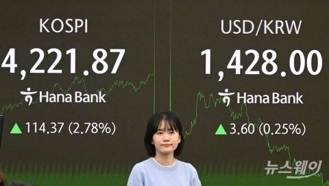 코스피가 반도체주 강세에 힘을 입고 상승 폭을 키우며 4200대로 사상 첫 돌파한 3일 오후 서울 중구 하나은행 딜링룸에서 직원이 업무를 보고 있다.