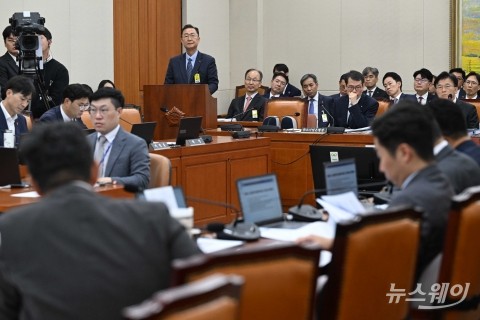 서원주 국민연금기금운용 본부장이 20일 오후 서울 여의도 국회 정무위원회에서 열린 금융위원회-한국산업은행-중소기업은행에 대한 2025년도 국정감사에 증인으로 출석해 의원 질의 듣고 어두운 표정으로 안경을 고쳐 쓰고 있다.
