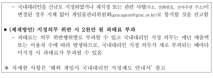 지정 대상에 해당하는 해외 게임사는 10월 23일 제도 시행에 맞춰 국내대리인을 지정하고, 게임물관리위원회에 즉시 통지하여야 한다. 이를 위반하는 경우 2천만 원의 과태료가 부과될 수 있다. 또한, 문체부는 제도의 원활한 시행과 관련 법령에 대한 올바른 이해를 돕기 위해 '해외 게임사 국내대리인 지정제도 안내서'를 국·영문으로 제작하여 배포한다.