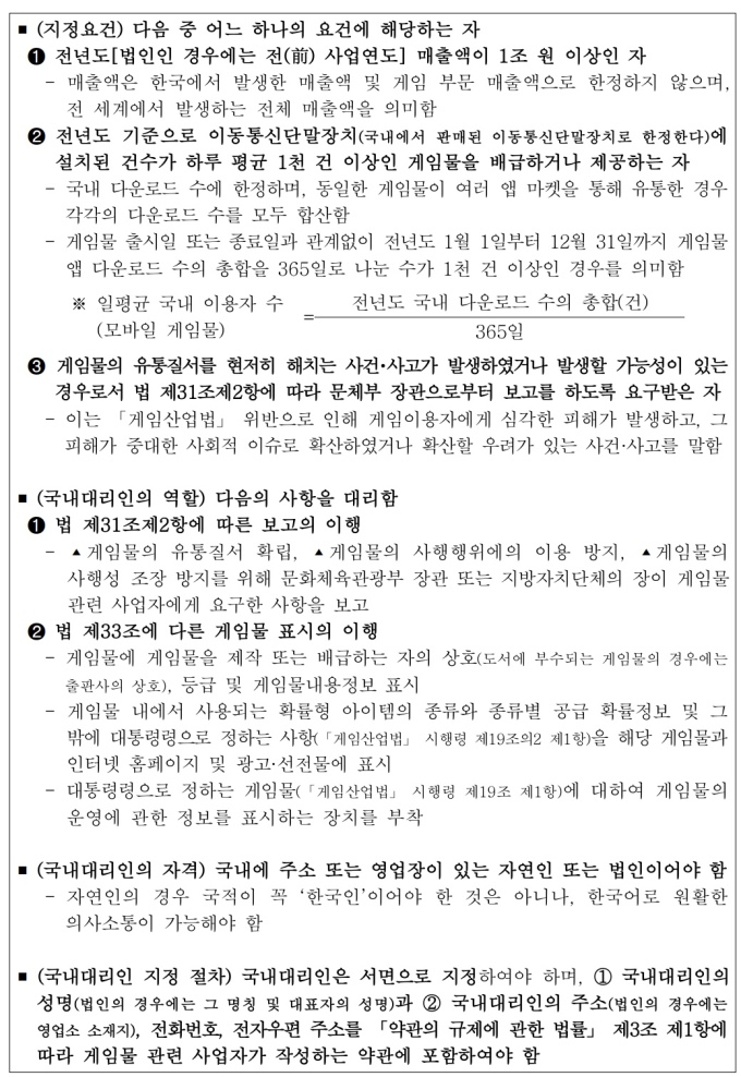 '게임산업법' 개정의 후속 조치로 마련된 이번 시행령 개정안에서는 법률에서 위임한 지정 요건을 정하였다. 해외 게임사 국내대리인 지정제도의 주요 내용은 다음과 같다.