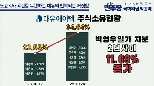 박 의원은 "피해자들이 말라 죽어 가는데 (박 회장과 그 가족은) 그 사이 계속 주력회사 대유에이텍의 지분을 늘렸다. 23%에서 무려 34%까지 올렸다"며 "영입인은 가족들로만 100%의 지분을 가지고 있는 회사다. 결국 돈은 에이텍으로 다 몰고 계열사들은 다 껍데기로 만들고 노동자들 임금 떼먹는 것조차 최초의 계획에 다 포함되어 있었다"고 질타했다.