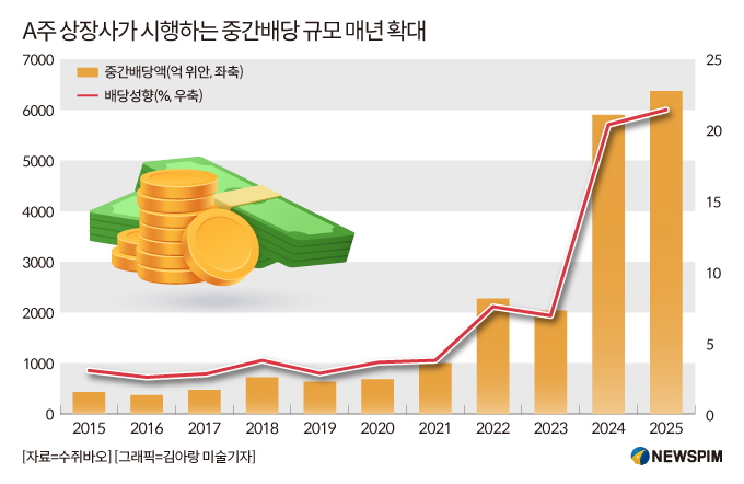 [서울=뉴스핌] 배상희 기자 = 2025년 10월 말 기준 선전증권거래소 상장사 중 507개 기업이 중간 배당 계획을 밝혔거나 이미 시행한 것으로 나타났다. 이는 전년 대비 대폭 증가한 수치로, 누적 배당금 총액은 1291억1200만 위안(약 26조원)에 달한다.