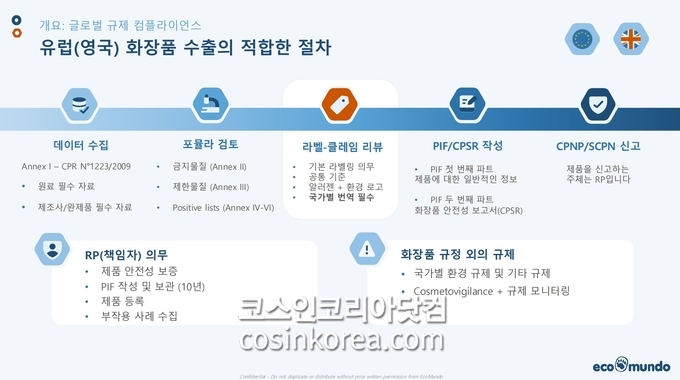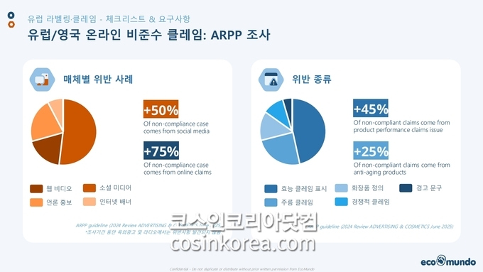[코스인코리아 김세화 기자] 글로벌 규제 컨설팅 기업 에코문도(EcoMundo) 코리아는 12일 ‘화장품 마케팅 클레임 준수’를 주제로 웨비나를 개최했다. 이번 행사에서는 화장품 업계 실무자를 대상으로 유럽과 미국 시장에서 요구되는 주요 규제 기준과 실무 체크포인트를 안내했다.