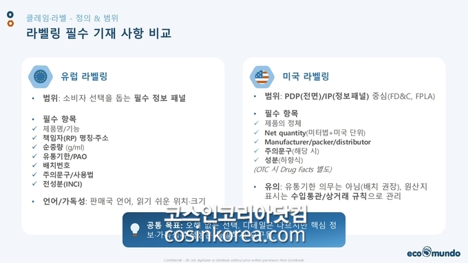웨비나는 △글로벌 규제 컴플라이언스 △클레임 및 라벨의 정의와 범위 △유럽의 라벨링 및 클레임 규정 △미국의 라벨링 및 클레임 규정 등 총 4개 세션으로 진행됐으며 강의는 에코문도의 박수현 매니저와 박지민 매니저가 맡아 각 시장의 규제 프레임워크를 비교하고, 기업이 유의해야 할 실무 지침을 제시했다.
