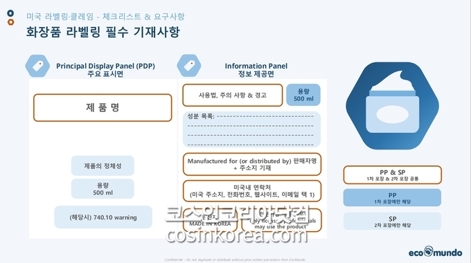 라벨링 규제와 관련해서는 유럽과 미국의 기본 원칙과 취지는 동일하나, 국가별 세부 기재 사항에는 차이가 있다. 유럽은 제품명, 기능, 유통기한 등 필수 정보를 포함한 라벨 패널을, 미국은 PDP(Principal Display Panel)와 정보 패널을 통해 제품명, 용량, 성분 등 핵심 정보를 명확히 표시하도록 규정하고 있다. 최근에는 온라인 상세 페이지 검토도 강화되고 있으며, 국가 부처, 플랫폼, 소비자층까지 다층적으로 모니터링이 이루어져 클레임과 라벨 관리가 더욱 민감하게 수행되고 있다.