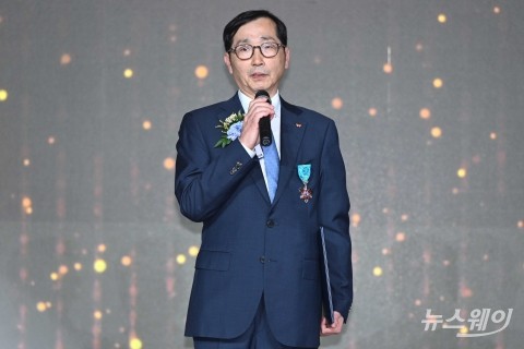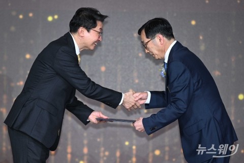 이억원 금융위원장이 31일 오후 서울 여의도 FKI타워에서 열린 회계의 날 기념식에서 김우현 SK하이닉스 부사장에게 산업포장을 수여한 뒤 기념촬영을 하고 있다.