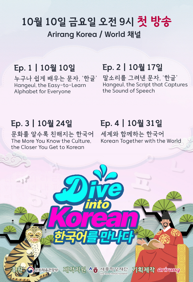 세종학당재단이 아리랑국제방송과 공동 제작한 교육 방송 ‘한국어를 만나다(Dive into Korean, 4부작)’도 한글 주간에 맞춰 10월 10일 오전 9시에 아리랑TV를 통해 전 세계 107개국에 첫 방송된다. 인기 한국사 강사 최태성이 진행을 맡은 이번 프로그램은 세종학당 장학생을 포함한 실제 외국인 학습자들이 함께 참여해 학습 현장의 생동감을 더했다.