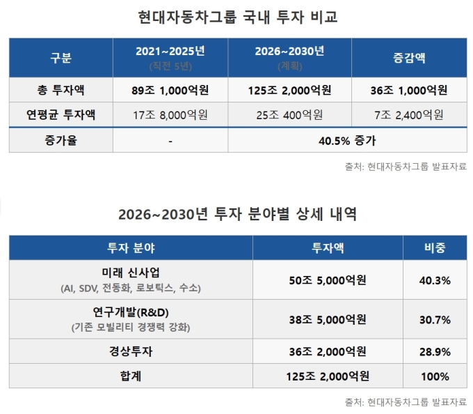 [서울=뉴스핌] 김승현 기자 = 현대자동차그룹이 2026년부터 2030년까지 5년간 국내에 총 125조2000억원의 사상 최대 규모 투자를 단행한다.