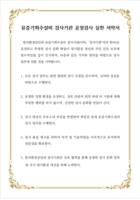 한국환경공단과 검사기관들은 서약을 통해 ▲ 관련 법령과 규정 준수 ▲ 상호 존중을 바탕으로 한 공정한 경쟁환경 조성 ▲ 주유소 현장의 의견을 반영한 책임있는 검사 수행 ▲ 검사 기술역량 강화를 통한 전문성 확보 등을 결의했다.