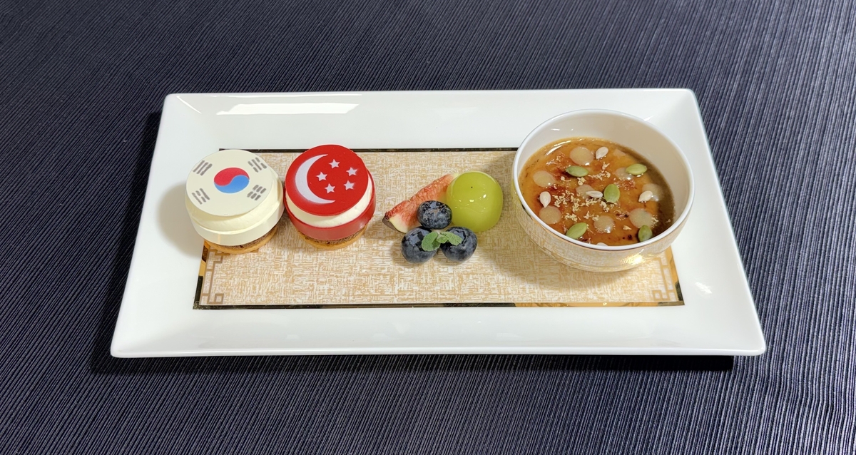 후식으로는 싱가포르를 대표하는 카야잼을 곁들인 곶감 케이크를 준비했다. 케이크 위에는 양국의 국기 요소를 장식해 우호 증진을 기원하는 마음을 표현한다.