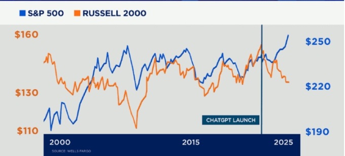 S&P500 지수는 5.5% 생산성이 올랐지만, 중소기업 중심의 러셀2000 지수는 12.3% 급락하며 격차가 확대됐고, 지수 성과에도 반영돼 S&P500은 74% 상승한 반면 러셀2000은 39% 오르는 데 그쳤다.