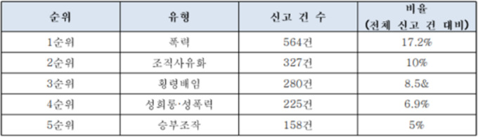 정현욱 의원실은 스포츠윤리센터의 자료를 공개, 2025년 8월 말 기준으로 접수된 전체 인권침해 사건은 총 3279건에 이르렀다고 전했다. 이 중 상위 5개 유형의 사건만 1544건에 달했으며, 폭력 관련 신고가 564건으로 가장 높은 비중(17.2%)을 차지했다. 폭력이 체육계 인권침해의 '최대 유형'이라는 사실이 다시 한번 확인된 셈이다.