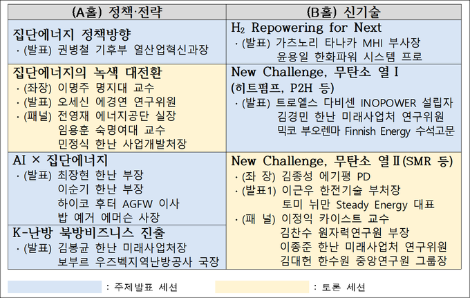 MOU 이후 ‘정책·전략’과 ‘신기술’ 2개의 분과로 나누어 각각 A홀과 B홀에서 본격적인 학술대회가 시작된다. A홀에서는 ▲집단에너지 정책방향 ▲AI × 집단에너지 ▲K-난방 북방비즈니스 진출에 대한 3개의 주제 발표와 ▲집단에너지의 녹색 대전환이라는 토론이 진행되며, B홀에서는 ▲H2 Repowering for Next ▲New Challenge, 무탄소 열(Ⅰ)이라는 제목의 주제 발표 2개와 ▲New Challenge, 무탄소 열(Ⅱ)라는 토론이 이어진다.
