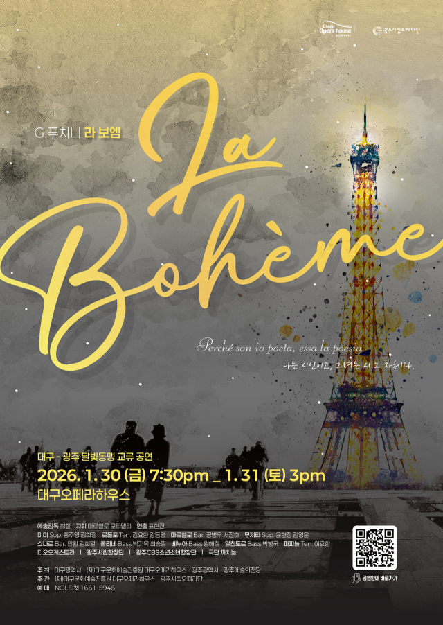 광주시립오페라단의 ‘라 보엠’은 1월 30일과 31일 양일간 대구 관객을 찾는다. 이번 공연은 대구와 광주가 문화예술·산업·관광 등 다양한 분야에서 상생 협력하는 광역 교류 프로젝트 ‘달빛동맹’의 일환으로 마련됐다.