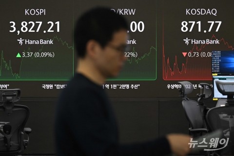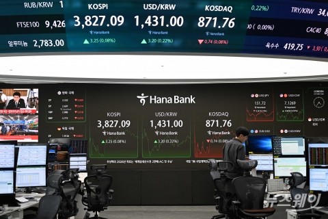 5거래일 연속 사상 최고치를 이어가던 코스피가 3900선 문턱에서 숨 고르기에 들어가며 상승 동력을 모색하고 있는 22일 오후, 서울 중구 하나은행 딜링룸에서 직원이 업무를 보고 있다. 이날 코스피는 3827로 소폭 상승한 장을 시작해 3800선까지 내려왔다가 현재는 3835선까지 오르고 있다.