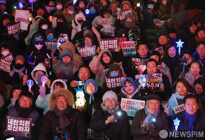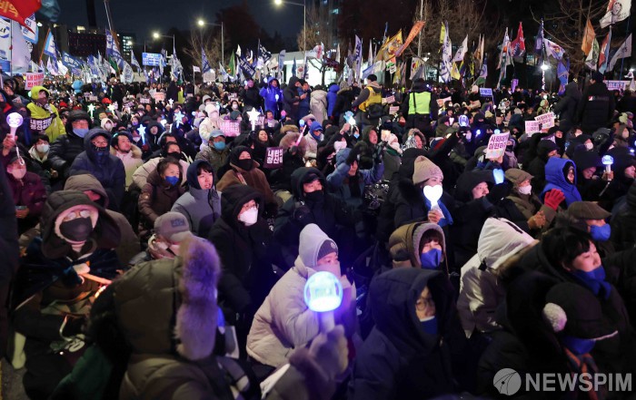 当时汝矣岛体感温度为零下11度,尽管寒风刺骨,市民仍穿着长羽绒服、围巾与口罩,手持应援棒将街道点亮。