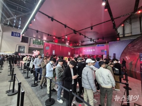 15일 오전 10시. 부산 벡스코 지스타 행사장 개장 시간이 되자 참관객들은 빨간 띠를 손목에 두르고 허공에 들어보이며 질서정연하게 입장을 시작했다. 10분 뒤 엔씨소프트의 신작 '아이온2' 시연존 앞 대기 줄은 이미 만석이었다. 엔씨 측 직원에게 현재 대기 인원을 묻자 "350명 정도 된다"는 답변이 돌아왔다.