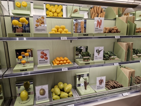 지하 1층 식품관 '트웰브(TWELVE)'는 변화를 가장 극적으로 보여주는 공간이었다. 매장 안으로 들어서면 기존 식품 매장에서 느낄 수 없던 시각적 연출이 먼저 눈에 들어왔다. 레몬 한 알, 당근 한 개가 단독 쇼케이스에 놓여 있고 제철 식재료는 색과 질감을 강조한 배열로 고객의 시선을 사로잡는다. 마치 패션 매거진의 화보를 옮겨놓은 듯한 진열 방식 덕분에 고객들은 매대 앞에서 자연스럽게 발걸음을 멈추고 한참을 바라보았다.