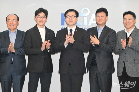 (오른쪽 다섯 번째)여한구 산업통상부 통상교섭본부장을 비롯한 참석자들이 9일 오후 서울 종로구 한국화학산업협회에서 열린 석유화학 업계 간담회에서 기념촬영을 하고 있다. (왼쪽 세 번째부터 다섯 번째까지)이정복 금호피앤비화학 대표이사, 엄찬왕 한국화학산업협회 부회장, 여 통상교섭본부장.